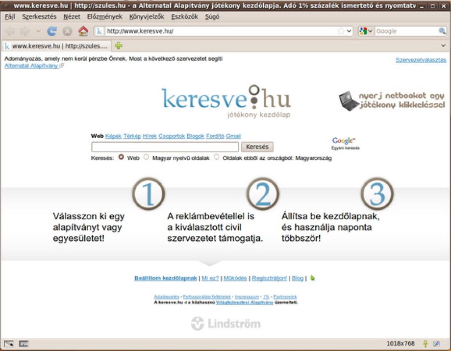 „Jótékony kezdőlap”-ot hozott létre és indított útjára 2010. március 11-én online nyereményjáték keretében a hazai adományozási kultúra fejlesztéséért dolgozó Világfejlesztési Alapítvány. A http://www.keresve.hu internetes oldalon a látogatók úgy támogathatják a civil szervezeteket, hogy az nem kerül pénzükbe. Az alapítvány a kezdőlap használatából befolyó reklámbevételeket – saját forrásaival kiegészítve – osztja szét a regisztrált non-profit szervezetek között. A jótékonysághoz csupán minél több adományozónak minél többször kell használnia az oldalt, ezzel növelve a szétosztható támogatások nagyságát és a kiválasztott szervezetek részesedését is.