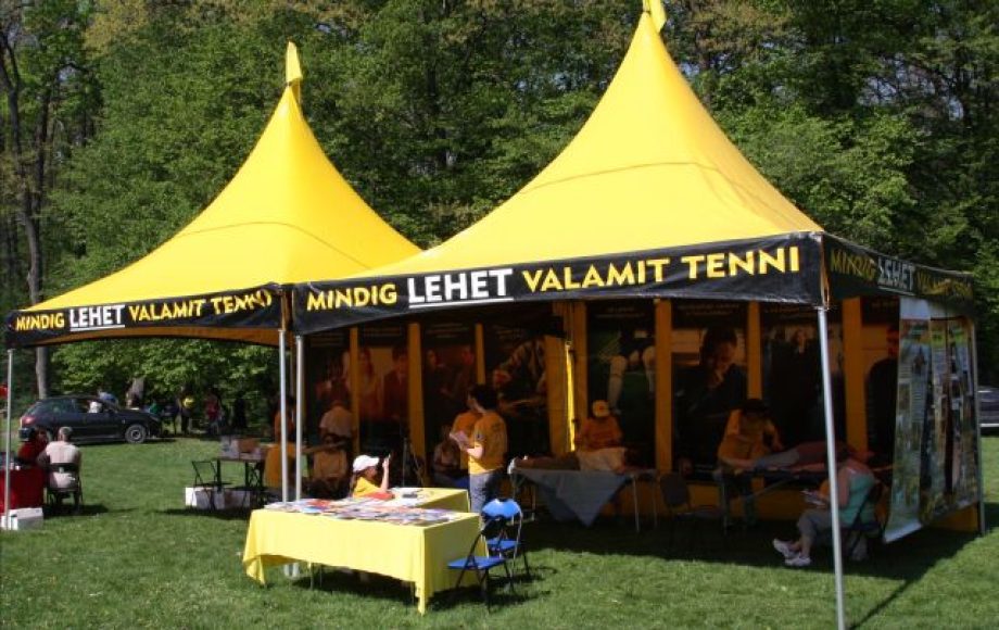 A Szcientológia önkéntes lelkészek sárga sátra Miskolcon fogadta május 1-én az érdeklődőket, akik megoldásokat találhattak az élet 19 különböző területén levő problémáikra az L. Ron Hubbard által írt füzetekben.