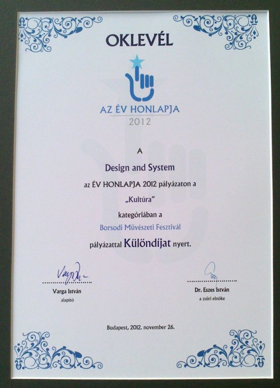 Mától a Borsodi Művészeti Fesztivál „Az Év Honlapja 2012” logo viselésére jogosulttá vált. Dr. Eszes István, a zsűri elnöke a weboldal tartalmi gazdagságát, hasznosságát, a portál felépítését emelte ki. A díj odaítélésében szerepet játszott a honlap megjelenése, az innovativitás, a tartalom minősége, a helyszínek, a programok, a szálláslehetőségek bemutatása, továbbá egy modern E-ticket jegyrendelési lehetőség is.