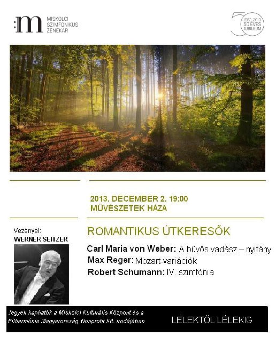 Az eredetileg szimfonikus fantáziának nevezett (és elsőnek szánt) szimfóniájában Schumann felesége, Clara portréját akarta megrajzolni, kinek témáját még jegyességük idején kottázta naplójába. Távolabbi célja viszont a műfaj felvirágoztatása volt, ahol a program igen eredeti módon lépett frigyre tárgyával: a hagyományosan különálló tételek összekapcsolása révén nagyszabású, mégis egységes mű született, ahol a téma különböző alakjai szellemként járják át az elgondolásában teljesen újszerű kompozíciót. A fin de siècle avagy a dekadencia alkotói gyakran „kopogtattak” inspirációért letűnt korok géniuszainak ajtaján. Az ebből fakadó eklektikus irányzatok egyik kivételes fenegyereke Max Reger volt, akiről az elmúlt évszázad alatt – mint Bach félresikerült reinkarnációjáról – számos szamárságot mondtak és írtak. Lehet, hogy orgonaművei egy részéből egyértelműen kihallható az ő „alfa és az omegája”, de a korra oly jellemző „szorongásos” hangulatot talán egyedül neki sikerült a leghihetőbben oldania, mint egyik utolsó zenekari művében, ahol zenéje a legnagyobb tisztasággal igyekszik a mozarti téma nyomdokaiba lépni. Werner Seitzer eddig jelentős német színházak dirigenseként szerzett hírnevet magának, de az elmúlt években egyre több kiemelkedő külföldi operaelőadás és szimfonikus koncert is gazdagította Werner Seitzer pályafutását.