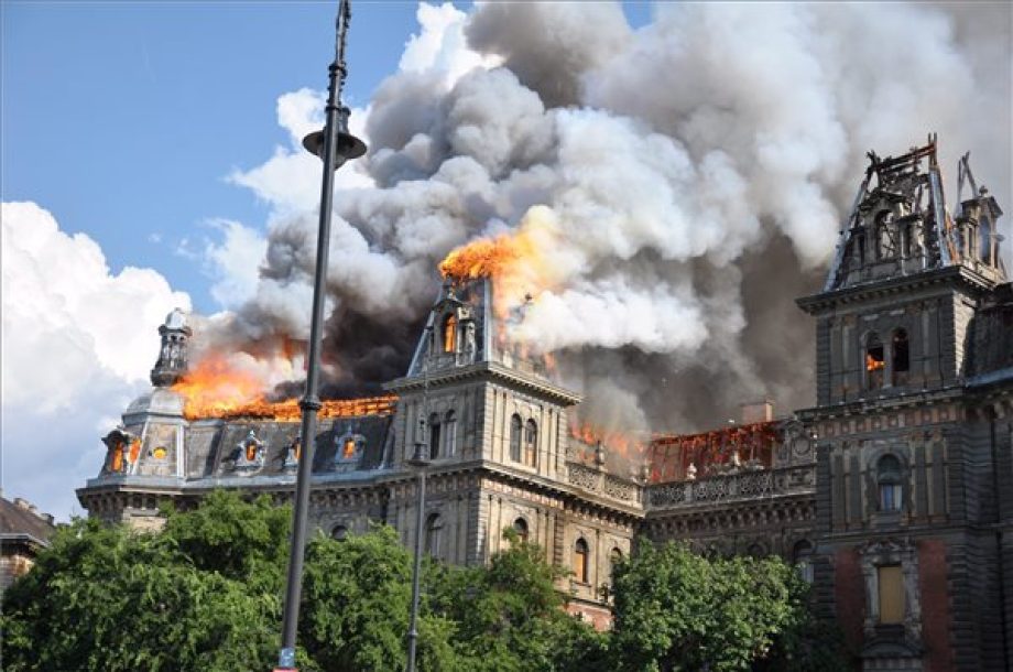 Szöveg: Budapest, 2014. július 15. Ég egy Kodály köröndi lakóház tetőszerkezete és legfelső emelete Budapesten 2014. július 15-én. MTI Fotó: Mihádák Zoltán