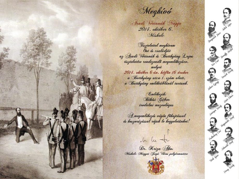 Miskolc Megyei Jogú Város Önkormányzata 2014. október 6-án, hétfőn 16.00 órától Batthyány Lajos emléktáblájánál (Miskolc, Batthyány u. 1.) az aradi vértanúk kivégzésének 165. évfordulója alkalmából megemlékezést tart.