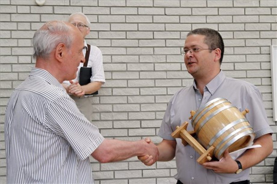 2015. augusztus 14. Szentmártoni János, az írószövetség elnöke (j) átadja a Nagyhordó-díjat az írótábor szervezésén 42 évig munkálkodó Sáray Lászlónak a 43. Tokaji Írótáborban zárónapján a II. Rákóczi Ferenc Általános Iskola aulájában 2015. augusztus 14-én. MTI Fotó: Vajda János – © MTI Fotó: Vajda János