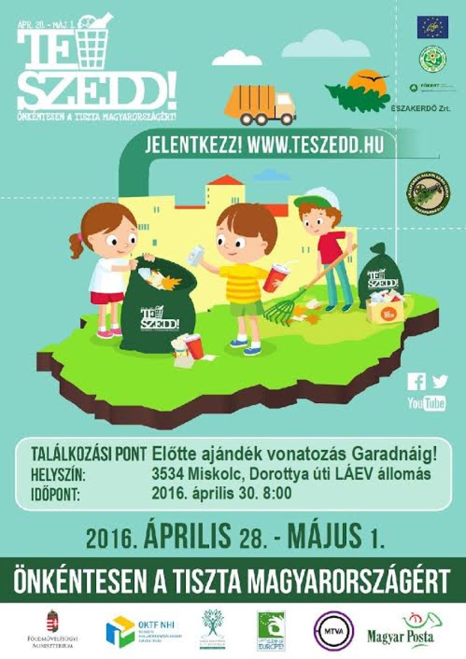 A korábbi évekhez hasonlóan, ismét csatlakozik az ÉSZAKERDŐ Zrt. a Te Szedd! Önkéntesen a tiszta Magyarországért! mozgalom szemétgyűjtő akciójához. 2016. április 30-án, Miskolcon egy rendhagyó takarítási programra várjuk az önkénteseket. Kollégáink az erdőt járva, sajnos rendszeresen találkoznak kisebb-nagyobb hulladékhalmokkal, amelyek nemcsak elcsúfítják, de károsítják is a környezetünket. Ezek felszámolása időről-időre visszatérő feladat számunkra. Turisztikai szempontból kiemelkedő fontosságú a társaságunk által üzemeltetett Lillafüredi Állami Erdei Vasút, idén először az útvonal megtisztítását tűztük ki célul. A hónap utolsó szombatján reggel 8 órára várjuk az önkénteseket Miskolcon, a Dorottya úti LÁEV állomásra. A program „ajándék” vonatozással indul, ugyanis a kisvasúttal visszük fel a résztvevőket Garadnára. A terveink szerint ugyanis a Garadna és Lillafüred közötti, mintegy hat kilométeres szakaszt szeretnénk rendbe tenni. Jelentkezni a www.szelektalok.hu/teszedd/ oldalon lehet az akcióra. Bízom abban, hogy az önkéntesekkel összefogva meg tudjuk tisztítani Miskolc környékét a hulladéktól – mondta Bózsó Gyula, az ÉSZAKERDŐ Zrt. műszaki osztályvezetője.