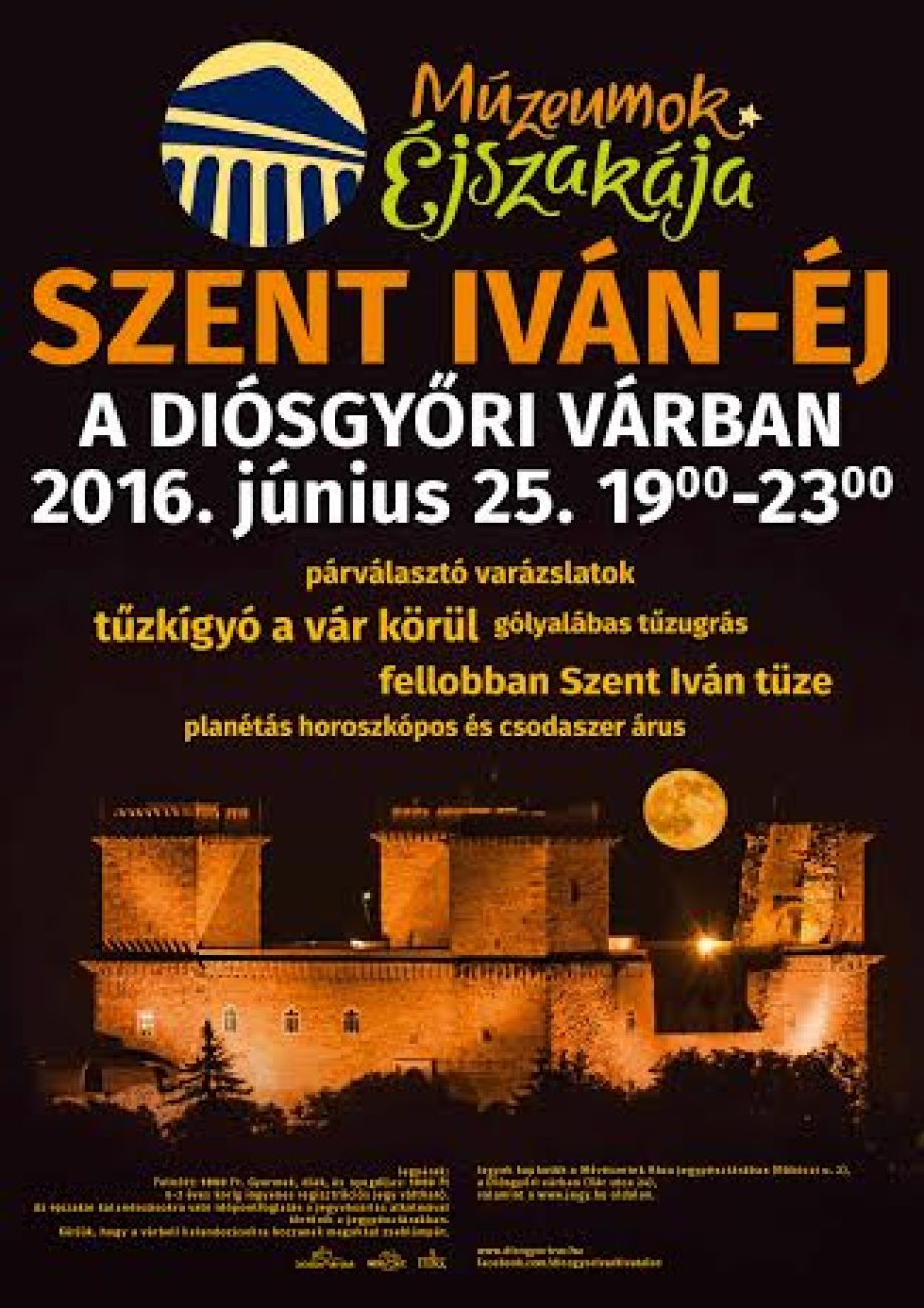 Június 25-én Szent Iván tüze világítja meg a Diósgyőri várat, amelynek fényénél a vár ismét titkokat mesél királyi szerelmekről, szenvedélyes táncokról, bűvös virágokról és népi hiedelmekről. Az év legrövidebb éjszakáján tűzkígyó öleli körbe a várat, planétás horoszkópos és veronai mágus vidámítja a vendégeket, párválasztó varázslatokat ismerhetünk meg, hogy aztán parazsat ugorva teljesüljenek legtitkosabb vágyaink. Az este hét órakor kezdődő program a Múzeumok Éjszakája országos rendezvénysorozat része.