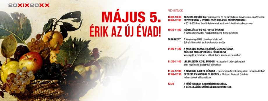 A hagyományokhoz híven idén is zenés, táncos forgataggal hirdeti meg új évadát a miskolci teátrum. Május 5-én a színház előtt színes programokkal és gyümölcsös fogásokkal várják az érdeklődőket, amelyeket maguk a művészek készítenek el a 2019-2020-as évad címeiből inspirálódva.