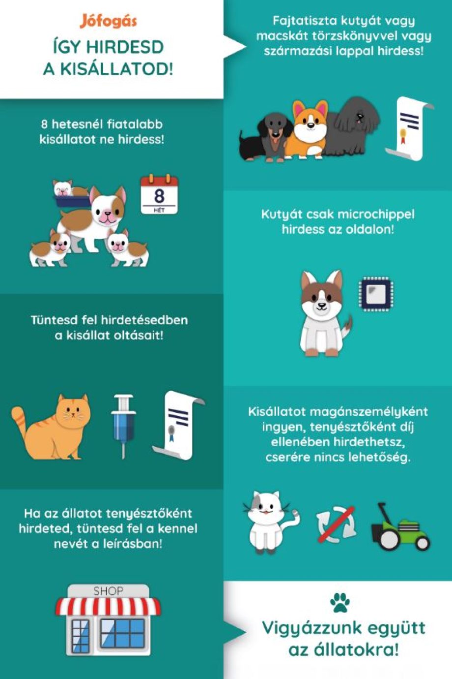 A Jófogás fontos feladatának tartja a figyelemfelkeltést és a szemléletformálást, valamint a jelenlegi és leendő állattulajdonosok edukációját, oldaláról ezért a tavalyi ÁSZF-szigorítást követően, 2020. április 8-tól folyamatosan és végleg törli azokat a hirdetéseket, amelyekben pénzért árulnak állatokat olyan hirdetők, akik tenyésztői tevékenységüket nem tudják hiteles dokumentációval igazolni.