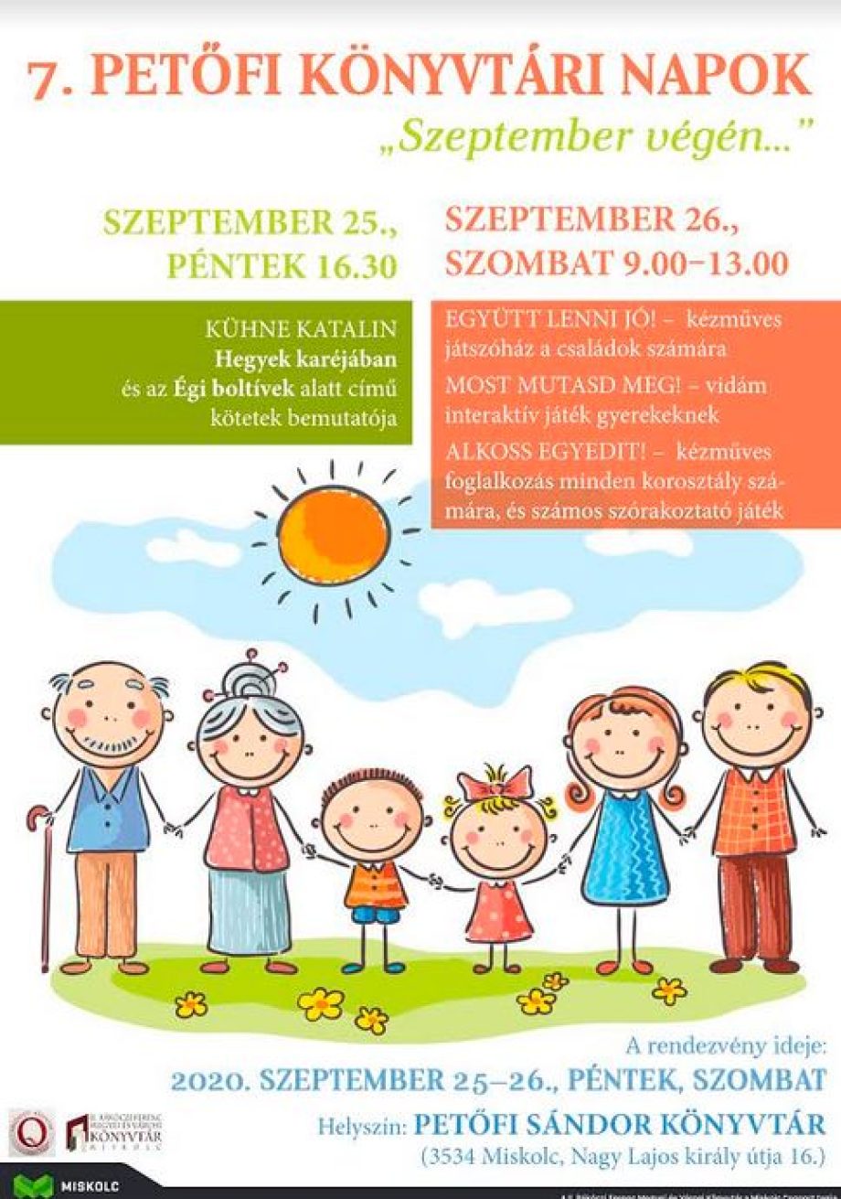 A II. Rákóczi Ferenc Megyei és Városi Könyvtár Petőfi Sándor Könyvtára hagyományteremtő szándékkal, a Szeptember végén című Petőfi-vershez kapcsolódva rendezi az első őszi hónap végén programját. Idén is kétnapos lesz a rendezvény, az első nap, szeptember 25-én 16:30-tól Kühne Katalin: Hegyek karéjában, valamint az Égi boltívek alatt című köteteinek bemutatójára invitálják az irodalom szerelmeseit. A könyvből a szerző családjának történetét ismerteti meg az olvasó, melyből elénk tárul országunk történelme is.