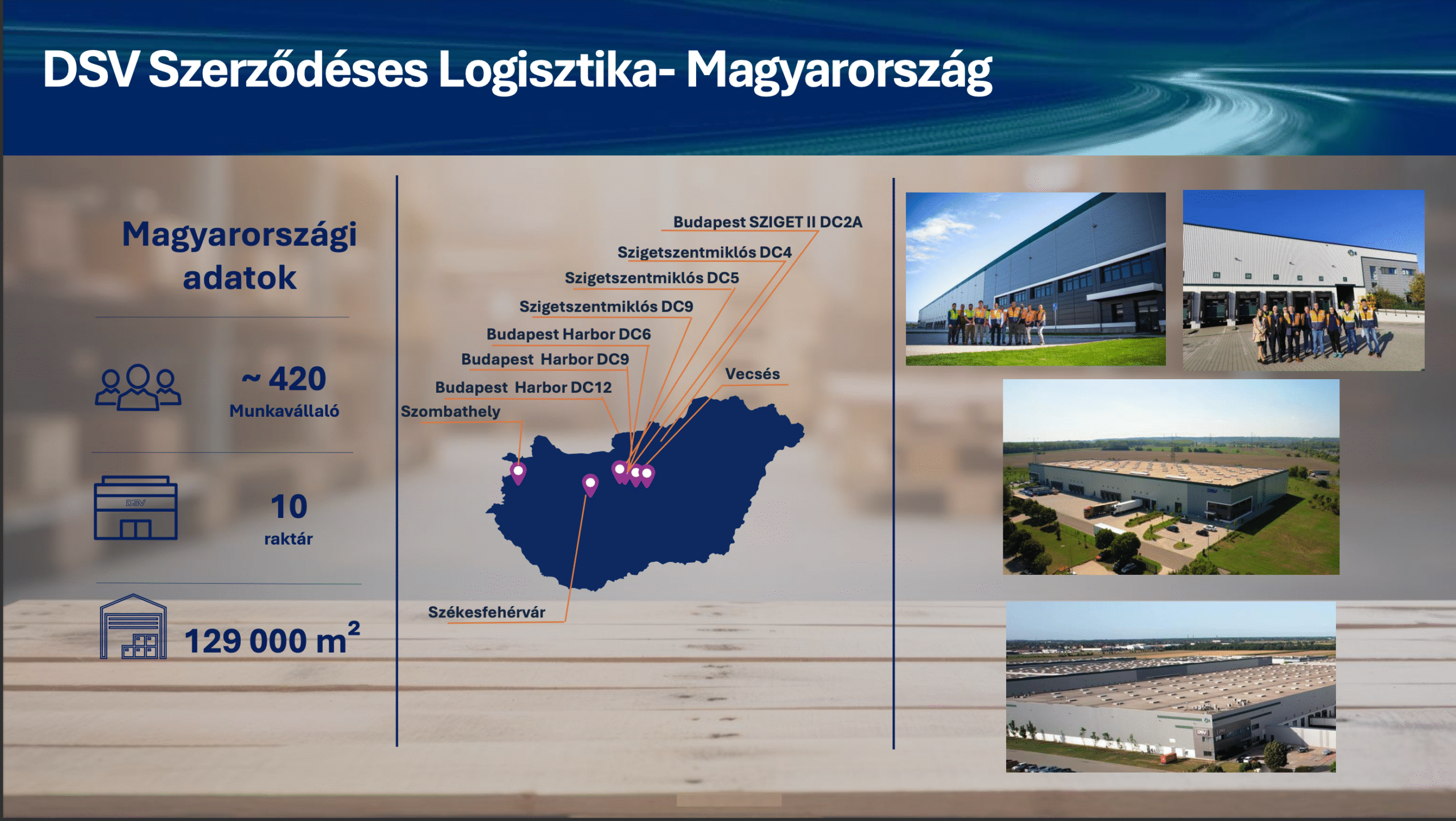 Ma a DSV Magyarországon három nagy divízióval nyújt logisztikai szolgáltatásokat: a közúti szállítmányozásért felelős DSV Hungária Kft.-vel, a légi és tengeri fuvarozást végző DSV Air & Sea Hungary Kft.-vel, valamint a szerződéses logisztikai szolgáltatásokat nyújtó DSV Solutions Hungary Kft.-vel, melyhez a speciális logisztikai feladatokat ellátó Fairs and Events üzletág is tartozik. Csak utóbbi több mint 420 munkatárssal, 10 modern raktárral és összesen több mint 100 ezer négyzetméter raktárkapacitással szolgálja ki partnereit. Ehhez most újabb mérföldkőként csatlakozik a jelentős méretű, közel 18 ezer négyzetméteres, környezetbarát technológiákkal felszerelt szigetszentmiklósi raktár.