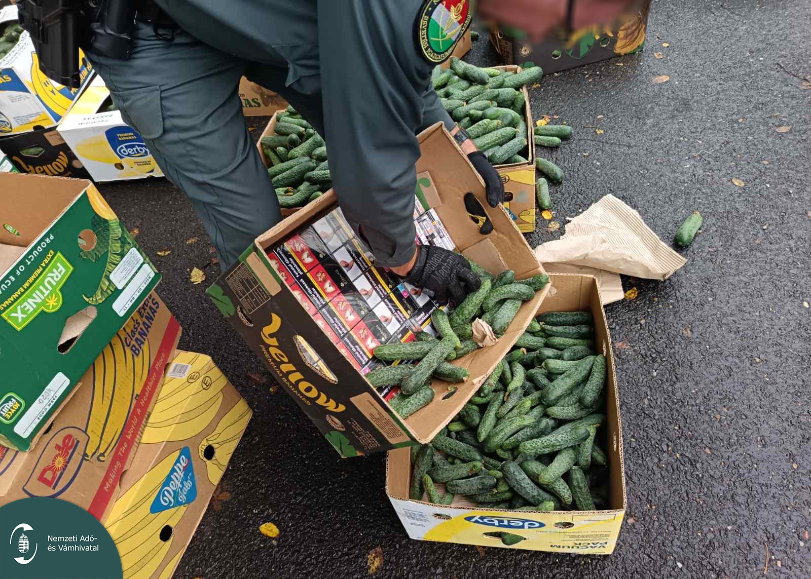 „Nikotinba eltett uborka” Uborkával, káposztával és dinnyével pakolták tele a román kisbusz utánfutóját, de a Nemzeti Adó- és Vámhivatal (NAV) Bevetési Igazgatóságának pénzügyőrei hamar rájöttek, hogy „bűzlik” a rakomány. A pénzügyőrök az M1-es autópályáról tereltek le egy Romániából Angliába tartó kisbuszt. A járműben a sofőr mellett nyolc utas ült, a hatalmas utánfutón pedig közel kétszáz dobozban és műanyagrekeszben sorakoztak a káposzták, uborkák és dinnyék. Egy piacon talán senkinek nem tűnt volna fel, de a rutinos egyenruhásoknak gyanússá vált a zöldségszállítmány. Miután lepakolták a ládákat, kiderült, hogy az uborkák alatt közel 5 000 doboz, különféle márkájú román cigaretta lapult. A 33 éves sofőr nem magyarázta túl a történetet: azt mondta, hogy a cigaretta az övé és azt az Angliában munkát vállaló honfitársainak vitte volna. Úgy tűnt, hogy a „munkaerőpiac” szabad áramlása mellett, a dohánytermék szabad áramlását újraértelmezte. A járőrök összesen 4 918 doboz, több mint 12 millió forint értékű cigarettát foglaltak le. Jövedéki törvénysértés és költségvetési csalás bűncselekmény miatt indult eljárás. A fiatal férfi több mint 17 millió forint bírságra is számíthat. A NAV pénzügyőrei az egész országban végeznek ellenőrzéseket, hogy kiszűrjék azokat a jogsértéseket, amelyek veszélyt jelentenek az Európai Unió és tagállamainak gazdaságára. Az utasforgalomra vonatkozó vám- és egyéb szabályok: https://nav.gov.hu/vam/utazas A közleményhez tartozó fénykép és videófelvétel médiaszerverünkről letölthető: https://transzfer.nav.gov.hu. Amely médium először használja a NAV médiaszerverét, a sajto@nav.gov.hu címre írt levélben kérhet jelszót. A filmek, fotók a NAV Facebook oldalán is megtalálhatók: https://www.facebook.com/NAVprofil/