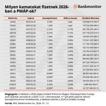 A PMÁP állományban még mindig vannak 1,5%-os kamatprémiumot fizető papírok, ilyet már új kibocsátások között nem lehet venni. És a másik végén van a 2035/I2 amelyik csak 0,1%-os kamatprémiumot ad az első időszak 6%-os kamata után. Így tehát a 2026-os kamatfordulók után a Prémium Magyar Állampapírok kamata 4,5% és 5,9% között lesz.