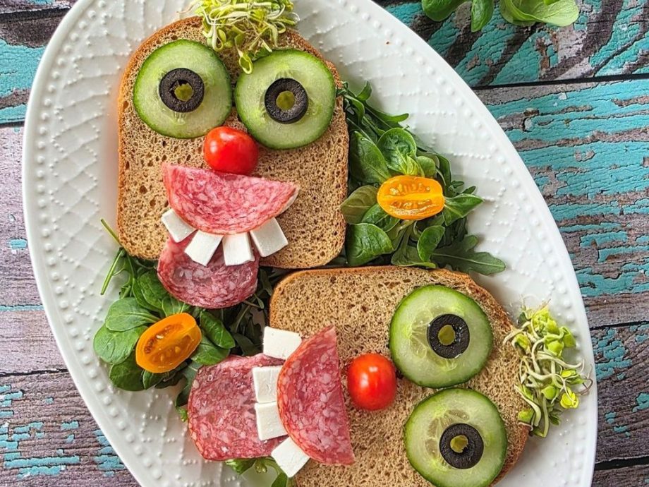 A kenyeret 6 cm-es korongra kiszúrjuk. Megkenjük a snidlinges krémmel. Szalámit teszünk rá. Erre kerülnek a fehér korongok. Rátesszük a szemek fehér részét, majd olajbogyóból a feketét, amikbe félbevágott pisztáciát rakunk. A szemek közé mandulát szúrunk. Késsel alakítjuk ki a szárnyakat az oldalán és olajbogyó bóbita kerül a szemek fölé.