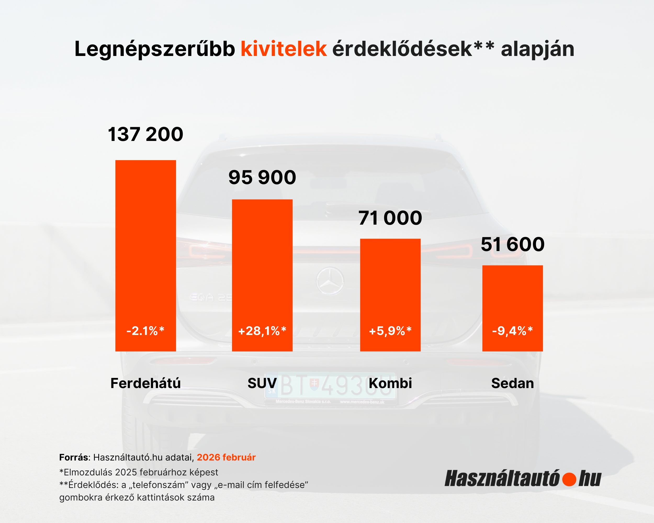 A Használtautó.hu legfrissebb adatai szerint 2025 februárjához képest mintegy 16 ezerrel több, összesen 442 212 db megkeresés érkezett 2026 februárjában. Ugyan a ferdehátúak továbbra is a legkeresettebb kivitelű autóknak számítanak, az SUV-k térnyerése folytatódik: 28,1%-kal többen, 95900-an kerestek városi terepjárókat az év második hónapjában, mint az elmúlt év azonos időszakában. A kombik és a sedanok esetében nincs jelentős eltérés: előbbiek 71000-rel, 5,9%-os növekedés után a harmadikak, míg utóbbiak 51600-zal, 9,4%-os csökkenés után állnak a negyedik helyen.