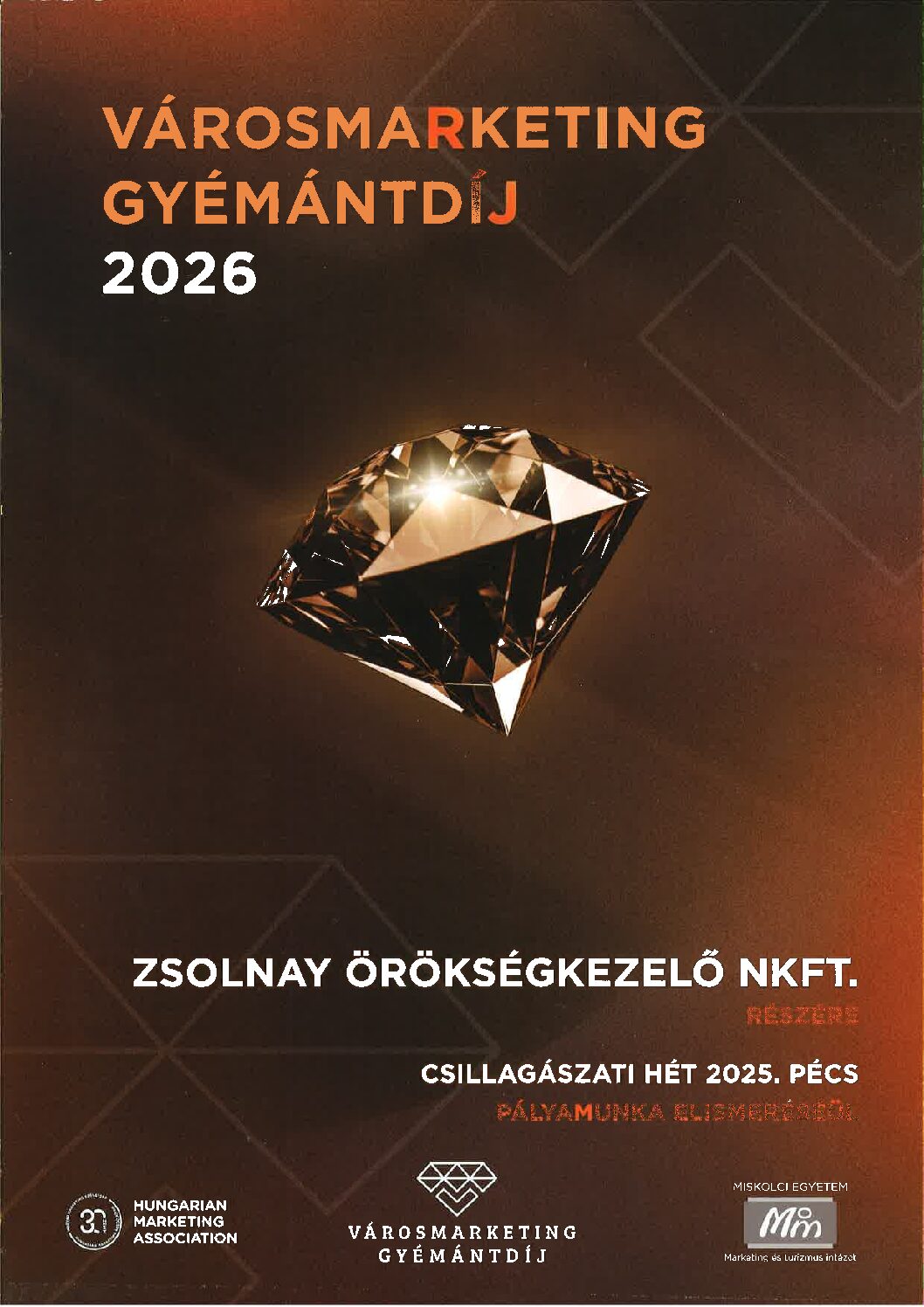 Újabb rangos szakmai elismerésben részesült a pécsi kulturális intézmények többségét üzemeltető Zsolnay Örökségkezelő NKft.: a társaság elnyerte a Városmarketing Gyémánt Díjat, ezzel 12-re emelkedett az általa megszerzett Gyémánt Díjak száma. Az idei elismerést a 2025-ös Csillagászati Hét marketingkommunikációs kampánya érdemelte ki.