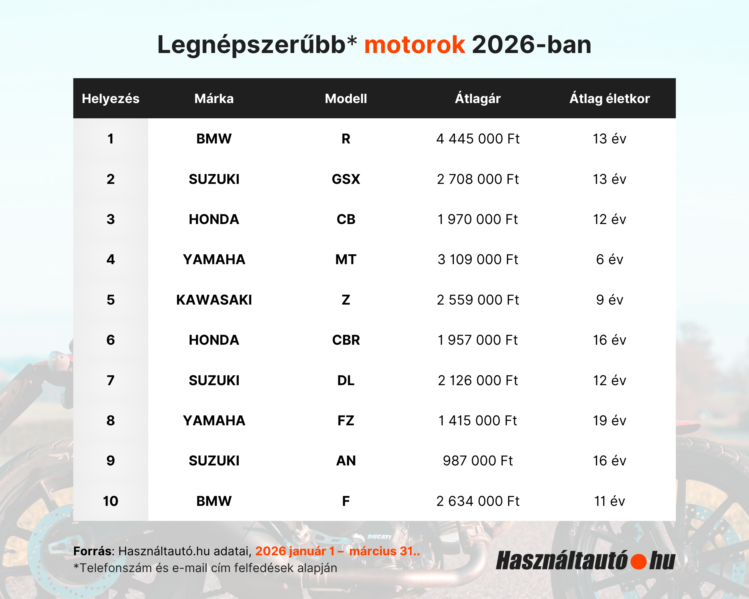 A Használtautó.hu adatai alapján 2026 első negyedévében a hazai használtmotor-piac stabil, jól látható trendeket mutatott: a kereslet egyértelműen néhány jól ismert modellcsalád köré koncentrálódik és a BMW toronymagasan vezet a többi márka előtt. A kínálat jelentős része már nem számít fiatalnak, és a futásteljesítmények is kifejezetten magasak, még motorokhoz képest is.