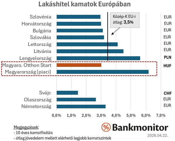 A Bankmonitor által összegyűjtött európai adatok egyértelmű képet adnak: a piaci alapú magyar lakáshitelkamat (kb. 6,2%) közel duplája a régiós átlagnak (3,5%). Szlovénia, Horvátország, Bulgária és Szlovákia 3% körüli kamatokon ad lakáshitelt, Németország és Olaszország is 3% alatt–körül hitelez. A magyar piaci szint csak a lengyelhez hasonlítható – de még a lengyel (5,6%) is alatta van a magyarnak.1