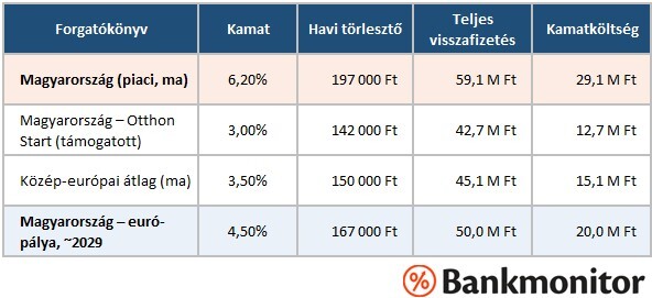Ha sikerül elérni a 2029-re prognosztizált 4,5%-os szintet, a visszafizetés 50 millió Ft körülire csökken, ami közel 9 millió Ft megtakarítás ma felvett hitelhez képest.